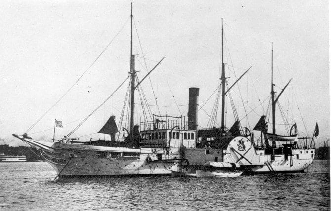 For these reasons, the USS Michigan was commissioned. The ship was manufactured in Pittsburg and reassembled in Erie, Pennsylvania. Her powerplant was a steam-powered sidewheel. As was common in early steamers, the USS Michigan also had three masts for wind power to augment the steam engine. The combination of steam engines and sails was crucial for this technically advanced warship to further travel range and ensure the ship would be maneuverable in the event of a steam engine failure. The vessel was rated for speed 12 knots, an incredible rate in those days. The ship had a crew of 88 officers and men
