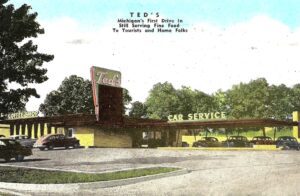 The legendary Ted’s Drive-In was a restaurant near the corner of Woodward and Square Lake Road on the border of Pontiac and Bloomfield Hills. According to WFMK, Ted’s Drive In is considered the first drive-in restaurant in Michigan. During the 1950s and 60s, this was the top place to hang out when cruising Woodward Avenue during the heyday of muscle cars. It started out in 1934 as a hot dog stand called Ted’s Trailer. Later the drive-in restaurant was known for its 5×5 hamburgers and Pig in a Blanket sandwich.