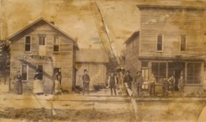 The image above prominently features the North Branch Hotel on the left, a simple two-story wooden structure with a sign reading “HOTEL.” To the right, another wooden commercial building housed a saloon, where Owen Trumbull lived in the upper quarters, according to the inscription. Unfortunately, all the buildings depicted in this photograph were lost to fire over the years, making this image a valuable historical record of North Branch’s past before modern development.
