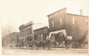 Downtown Ubly in the early 1900s offered a glimpse into the social life of a small Thumb town. Brick storefronts lined Main Street, where wagons were hitched along the curbs. General stores, hardware shops, and groceries supplied everyday needs.