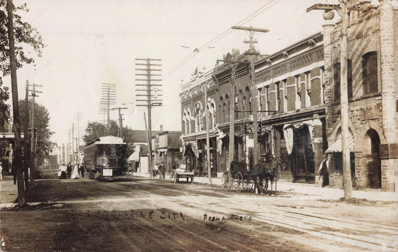 Downtown Marine City in the early 1900s, showing the Hotel DuPont (right) and an electric interurban streetcar in front. The DuPont/Colonial Hotel was a prominent fixture for travelers and social gatherings.
