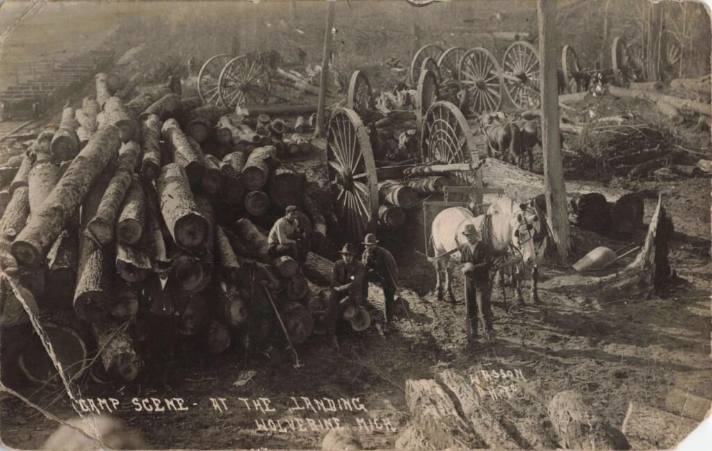 Wolverine’s natural setting is defined by the Sturgeon River, a swift, clear stream that courses right through town. During the logging boom, the Sturgeon was essentially a log highway. In spring, “log drives,” lumberjacks rolled tens of thousands of logs into the river’s swollen currents to float them toward sawmills downstream. “The river was a real asset to the logging industry…this is how they moved the logs down the water to the sawmills,” recalls local historian Dave Bird. Men with peavey poles guided the timber and broke up logjams. Place names like “The Landing” near Wolverine mark spots where logs were temporarily yarded or loaded. One vintage photo, labeled “Camp Scene, At the Landing,” shows lumbermen and horses on a riverbank, stacked high with logs, capturing a moment from these log drive operations.