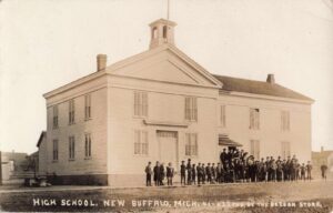 This vintage postcard shows New Buffalo’s high school — a white, clapboard building with a small cupola — as dozens of students line up out front for the camera. The caption along the bottom reads, “High School, New Buffalo, Mich.,” and notes it was “Pub. by The Beeson Store.”