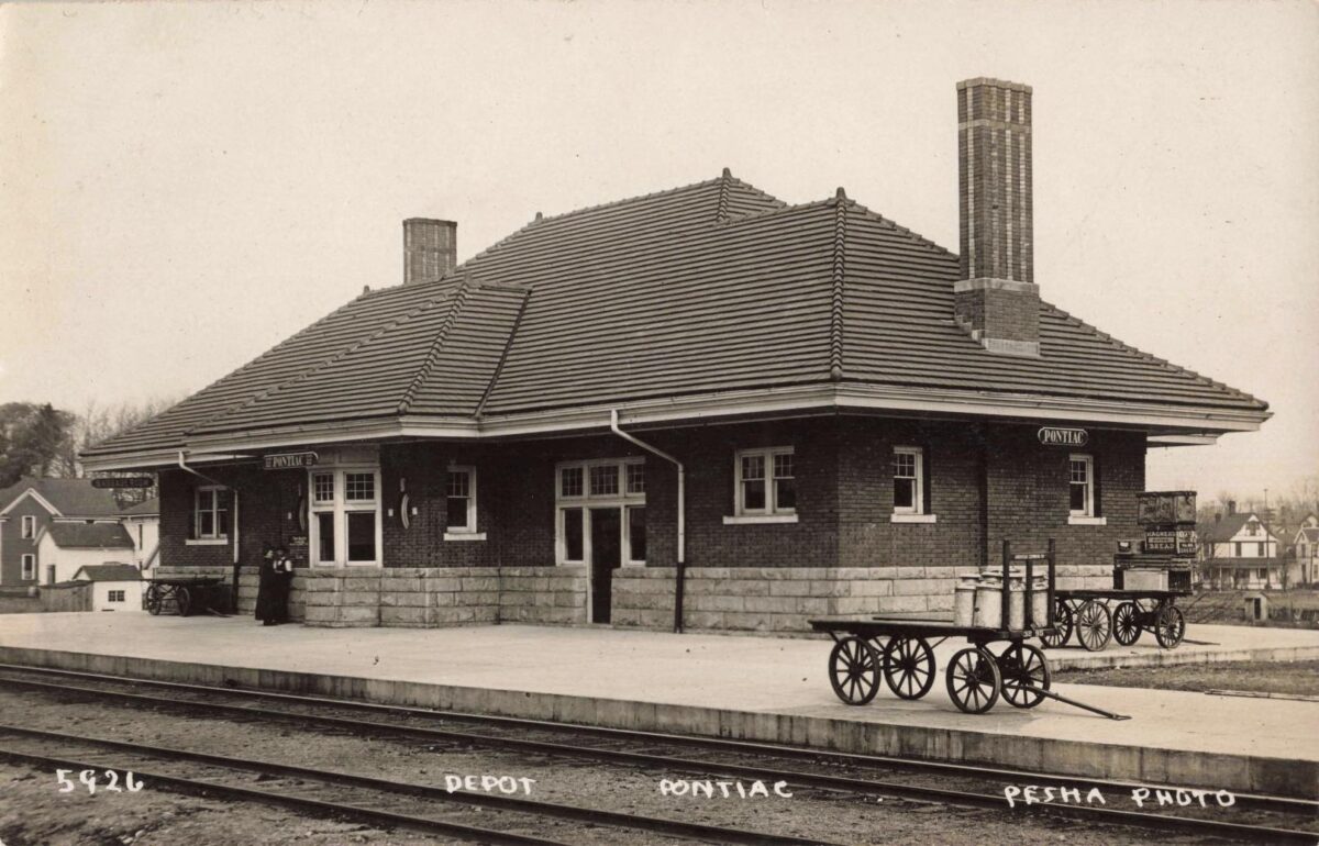 A brick railroad depot marked “Pontiac” sits beside the tracks, with a handcart and milk cans staged on the platform.