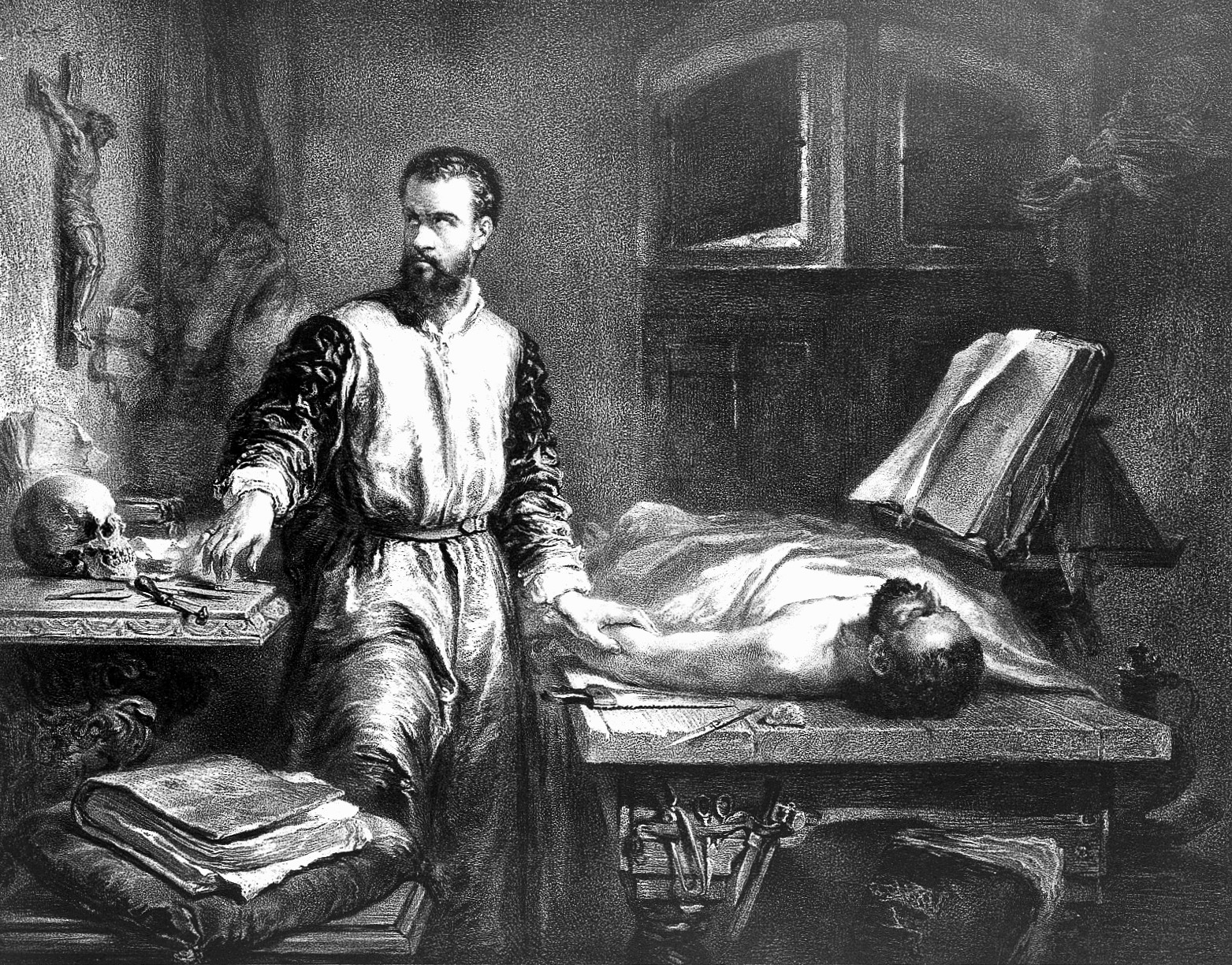 between tables and cadaver, with folios, skulls