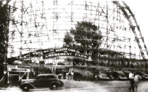 The wooden roller coaster at Walled Lake Amusement Park towers over the entrance as cars pull in and a “Free Parking” sign points the way. This park (also called Walled Lake Park) became a big summer draw for metro Detroit, especially after the Flying Dragon coaster debuted in 1929.